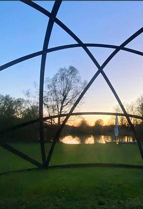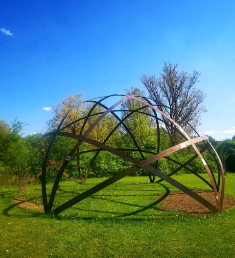 Hier am wunderschönen Beutwangsee kam die Inspiration zur Gestaltung des ersten Baldachins. Das Stahlfachwerk formt und trägt die Halbkugel. Frau Weber-Henzler, Betreiberin des Beutesee Kiosks und ich Martin Böhm– haben gehofft, dass er stehen bleiben darf. Zu meinem Bedauern ist der Baldachin in Nürtingen nur noch in Bildform verfügbar und musste abgebaut werden.